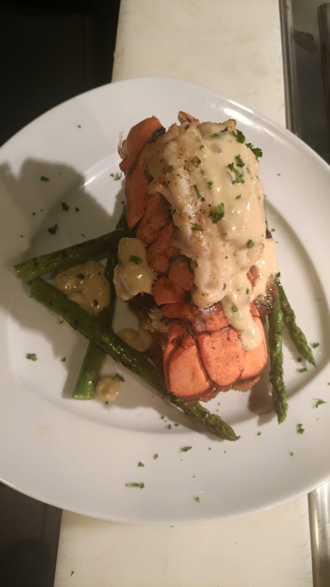 Half Cajun Marinated Chicken, Yellow Stone Grits, Broccolini, Chicken Jus